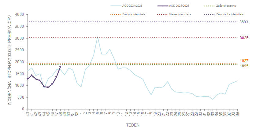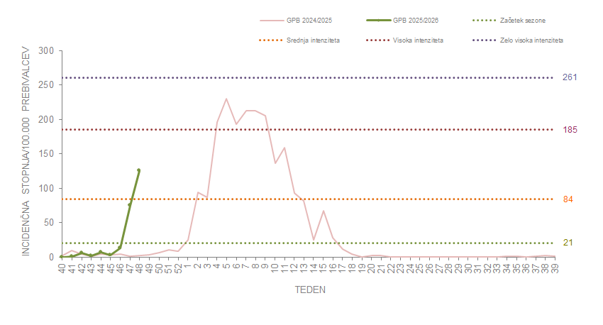 V tednu 48/2025 je število obiskov in posvetov zaradi podobne bolezni (GPB) je še naprej naraščalo (skupna incidenca 125,8/100000 prebivalcev) in je v območju srednje intenzitete. Večje je bilo tudi število obravnav zaradi akutnih okužb dihal (AOD), a je bilo še pod sezonskim pragom. Največji porast GPB je bil med malčki od 0 do 3 let in med otroci od 4 do 7 let.