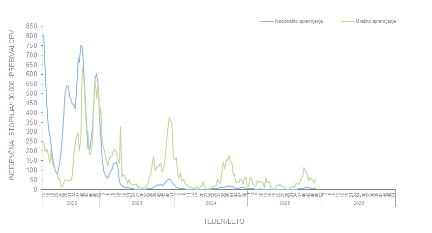 V tednu 48/2025 so podatke prispevali mikrobiološki laboratoriji: NLZOH Ljubljana, NLZOH Celje, NLZOH Kranj, NLZOH Maribor, NLZOH Novo mesto, NLZOH Koper, NLZOH Nova Gorica, NLZOH Murska Sobota, Klinika Golnik, Inštitut za mikrobiologijo in imunologijo MF, Splošna bolnišnica Slovenj Gradec, Splošna bolnišnica Dr. Franca Derganca Nova Gorica in Klinični inštitut za specialno laboratorijsko diagnostiko UKC Ljubljana.