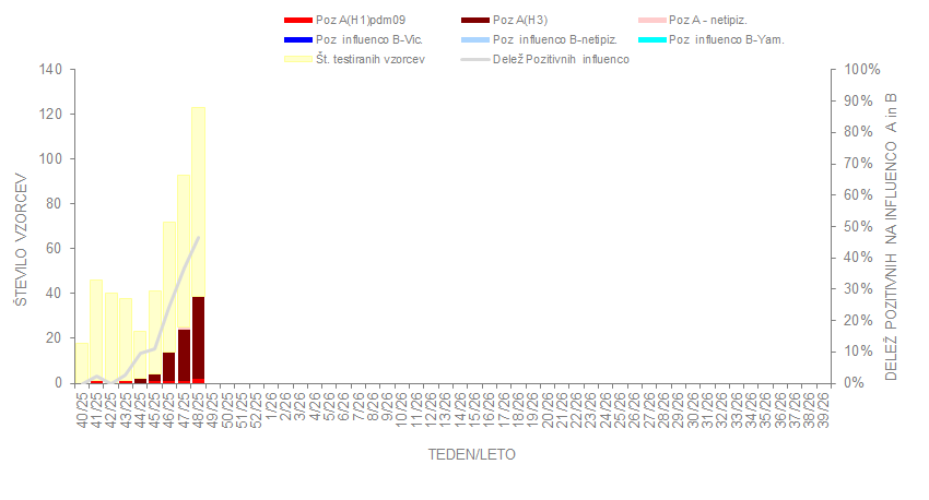 V sezoni 2025/26 (od 29. 9. 2025 do 30.11. 2025) smo v Sloveniji laboratorijsko (z dokazovanjem nukleinskih kislin) skupno potrdili 505 primerov okužbe z influenco tipa A in nobenega primera okužb z influenco tipa B.