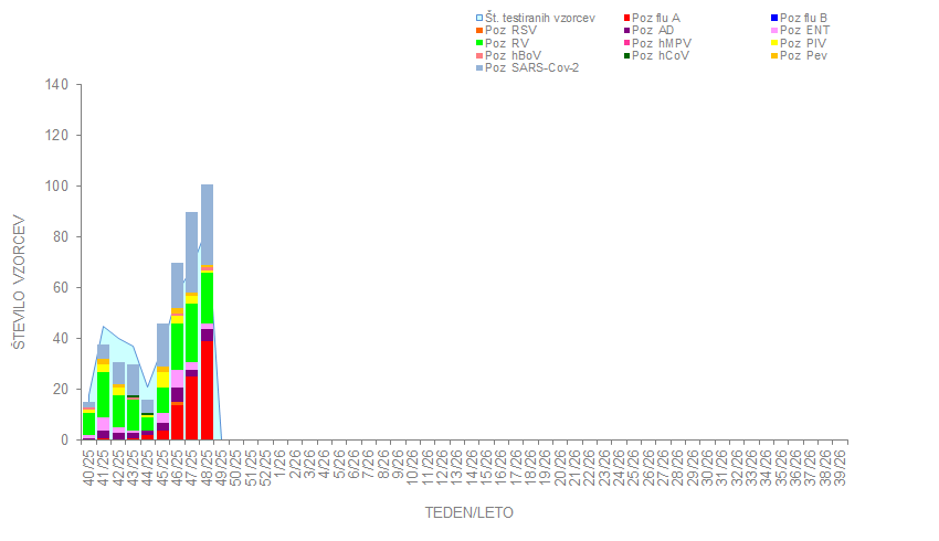 V tednu 48/2025 smo laboratorijsko (z dokazovanjem nukleinskih kislin) potrdili okužbo z RSV pri štirih bolnikih, od tega po enega pri enem 9 mesečnem dojenčku, pri 2 letnem otroku in pri 59 letnem bolniku. Za en primer nimamo podatka o starosti.