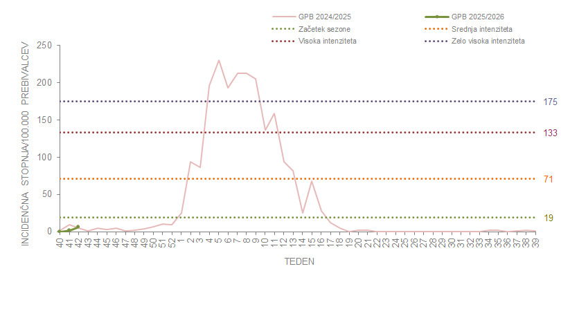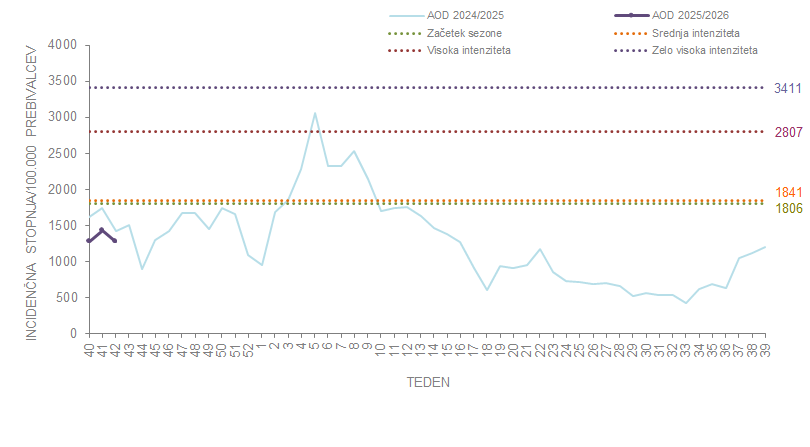 V tednu 42/2025 je bilo število obiskov in posvetov zaradi akutnih okužb dihal (AOD) podobno kot pretekli teden in še pod sezonskim pragom. Obiskov in posvetov zaradi gripi podobne bolezni (GPB) je bilo malo.