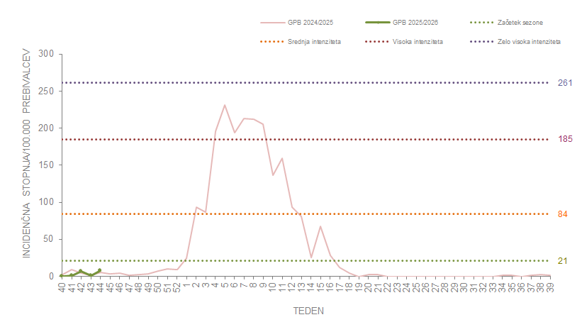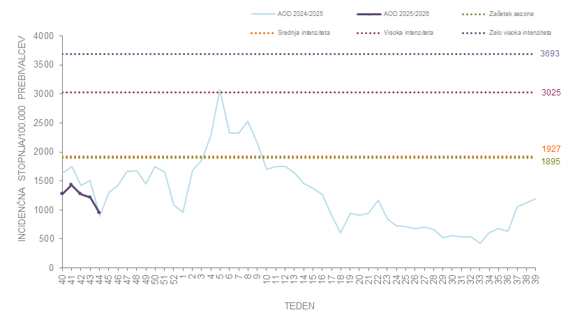 V tednu 44/2025 je bilo število obiskov in posvetov zaradi akutnih okužb dihal (AOD) podobno kot v preteklih tednih in pod sezonskim pragom. Obiskov in posvetov zaradi gripi podobne bolezni (GPB) je bilo malo.