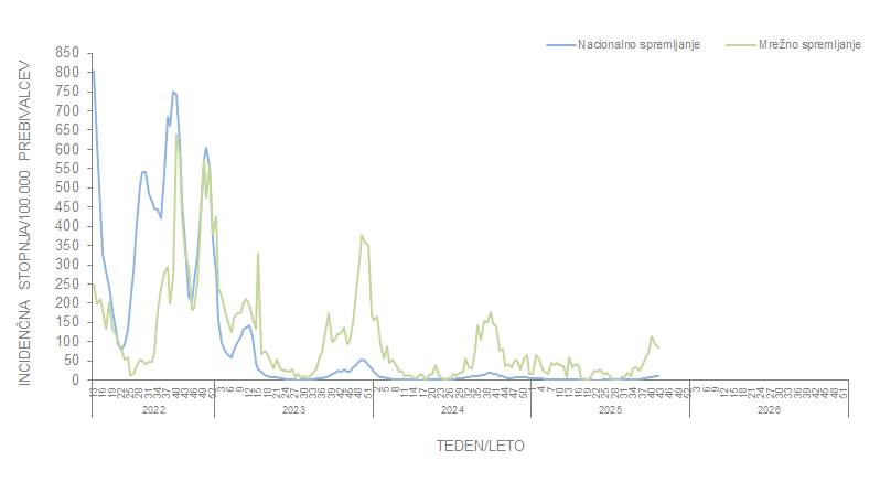 V tednu 42/2025 so podatke prispevali mikrobiološki laboratoriji: NLZOH Ljubljana, NLZOH Celje, NLZOH Kranj, NLZOH Maribor, NLZOH Novo mesto, NLZOH Koper, NLZOH Nova Gorica, NLZOH Murska Sobota, Klinika Golnik, Inštitut za mikrobiologijo in imunologijo MF, Splošna bolnišnica Slovenj Gradec, Splošna bolnišnica Jesenice, Splošna bolnišnica Dr. Franca Derganca Nova Gorica in Klinični inštitut za specialno laboratorijsko diagnostiko UKC Ljubljana.