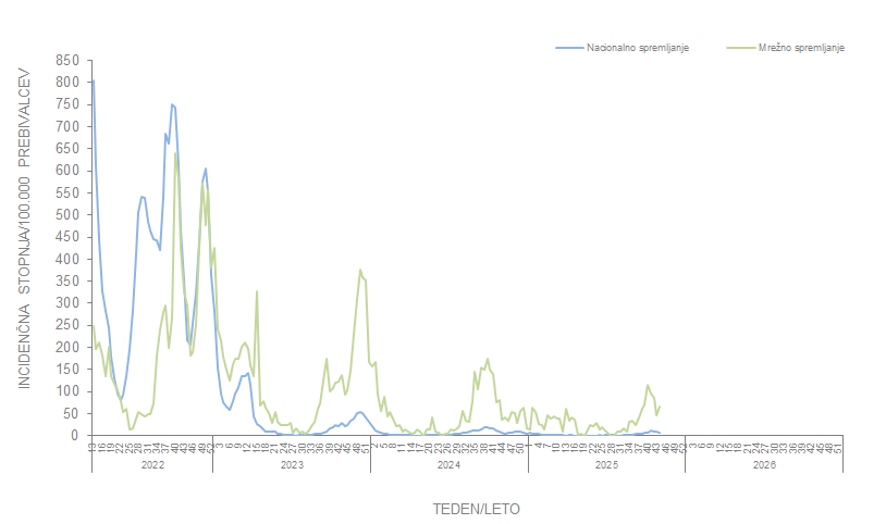 V tednu 44/2025 so podatke prispevali mikrobiološki laboratoriji: NLZOH Ljubljana, NLZOH Celje, NLZOH Kranj, NLZOH Maribor, NLZOH Novo mesto, NLZOH Koper, NLZOH Nova Gorica, NLZOH Murska Sobota, Klinika Golnik, Splošna bolnišnica Slovenj Gradec, Splošna bolnišnica Jesenice, Splošna bolnišnica Dr. Franca Derganca Nova Gorica in Klinični inštitut za specialno laboratorijsko diagnostiko UKC Ljubljana.