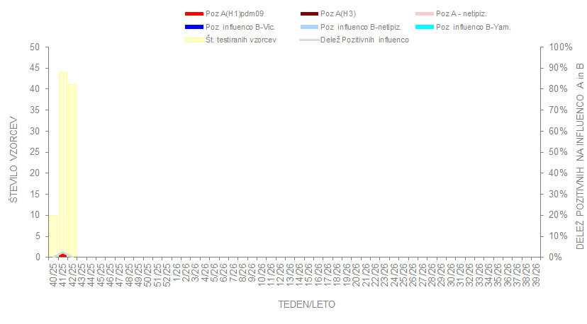 V sezoni 2025/26 (od 29. 9. 2025 do 19. 10. 2025) smo v Sloveniji laboratorijsko skupno potrdili 13 primerov okužbe z influenco tipa A in nobenega primera okužbe z influenco tipa B.
