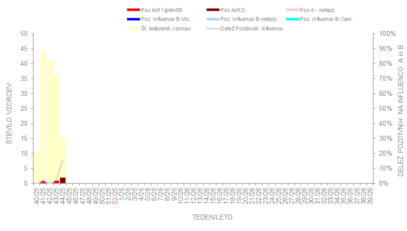 V sezoni 2025/26 (od 29. 9. 2025 do 02. 11. 2025) smo v Sloveniji laboratorijsko skupno potrdili 27 primerov okužbe z influenco tipa A in nobenega primera okužbe z influenco tipa B.