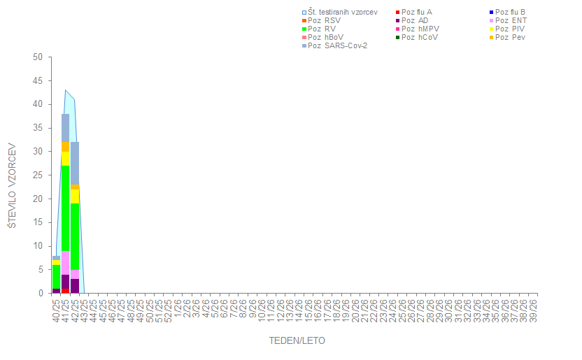 Legenda: A(H1)-influenca podtipa A(H1N1)pdm09, A(H3)-influenca podtipa A(H3N2), B(Victoria)-influenca tipa B, linija Victoria, B(Yamagata)-influenca tipa B, linija Yamagata, RSV-respiratorni sincicjski virus, AD-adenovirus, ENT-enterovirus, RV-rinovirus, ENT/RV-enterovirus in rinovirus skupaj (test ju ne loči), hMPV-humani metapnevmo virus, PIV-virus parainfluence, hBoV-humani boka virus, PeV-humani parechovirus, SARS-CoV-2-SARS koronavirus 2.