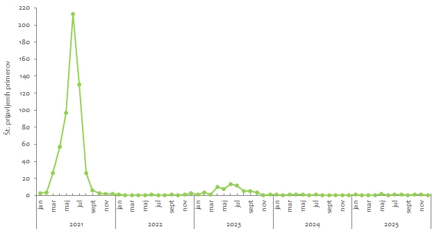 Slika 1: Število prijavljenih primerov HMRS po mesecih, Slovenija, 2021–2025