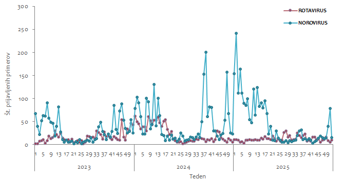 Slika 1: Število prijavljenih primerov norovirusnih in rotavirusnih okužb po tednih, Slovenija, 1.1.2023–31.12.2025