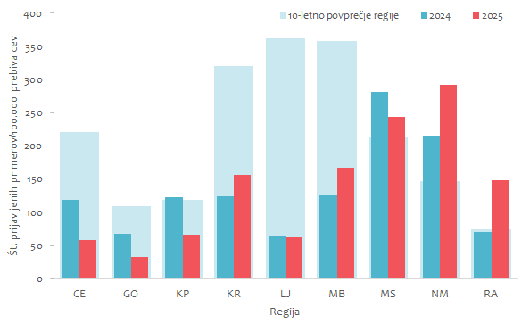 Slika 2: Število prijavljenih primerov norovirusnih okužb/100.000 prebivalcev po zdravstvenih regijah, Slovenija, 2024, 2025 ter 10-letno povprečje (2015–2024)