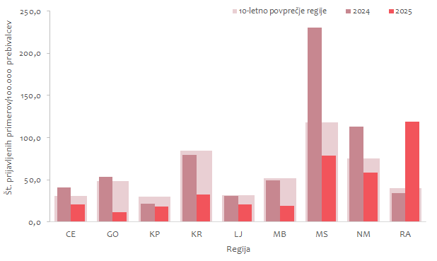 Slika 3: Število prijavljenih primerov rotavirusnih okužb/100.000 prebivalcev po zdravstvenih regijah, Slovenija, 2024, 2025 ter 10-letno povprečje (2015–2024)