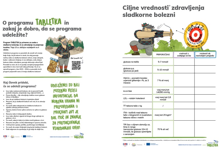 Slika 4: Informativni letak in cilji zdravljenja; primera gradiv za udeležence programa TABLETKA z ilustrativnim likom Florjanom, osebo s sladkorno boleznijo tipa 2