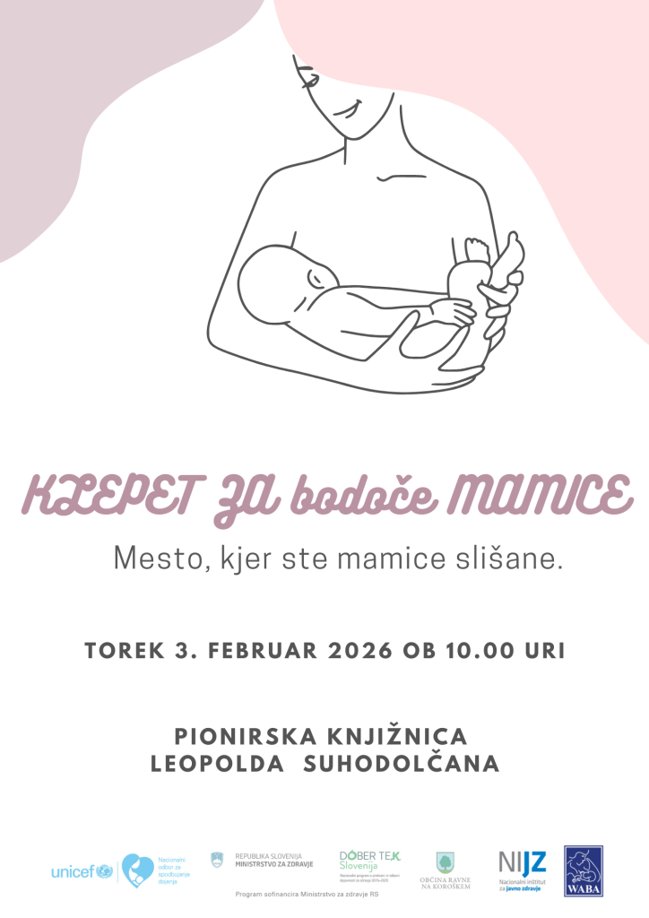 Vstop v materinstvo prinaša veliko lepih trenutkov, pa tudi spremembe, vprašanja in izzive. Na klepetu za mamice, ki poteka vsak prvi torek v mesecu, lahko (bodoče) mamice v varnem in prijetnem okolju delijo (pre)izkušnje in občutke, ki jih prinaša materinstvo – brez obsojanja, z razumevanjem in podporo. Mamice se bodo srečale v torek, 3. februarja, ob 10. uri, v prostorih Pionirske knjižnice Leopolda Suhodolčana na Ravnah na Koroškem. Na srečanju bo prisotna tudi IBCLC svetovalka za dojenje.