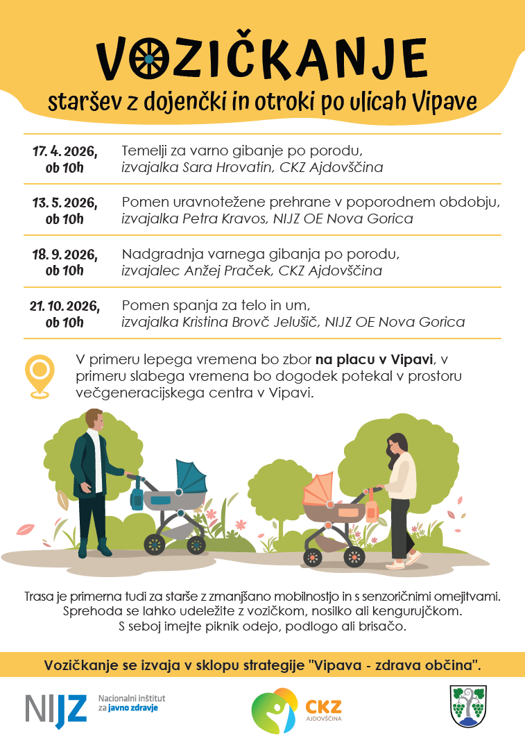 Na Območni enoti NIJZ Nova Gorica smo v sodelovanju s Centrom za krepitev zdravja Ajdovščina in Občino Vipava pripravili pester nabor dogodkov v okviru Vozičkanja po ulicah Vipave, ki v prvi vrsti nagovarja starše z dojenčki. Vsebine posameznih srečanj so gibanje po porodu, uravnotežena prehrana in spanje.