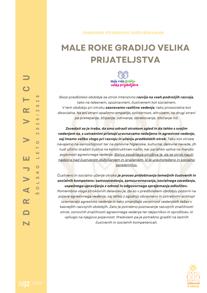 V sklopu programa Zdravje v vrtcu smo pripravili strokovno izobraževanje, ki naslavlja vsebino obvladovanja neželjenega vedenja pri predšolskih otrokih.
