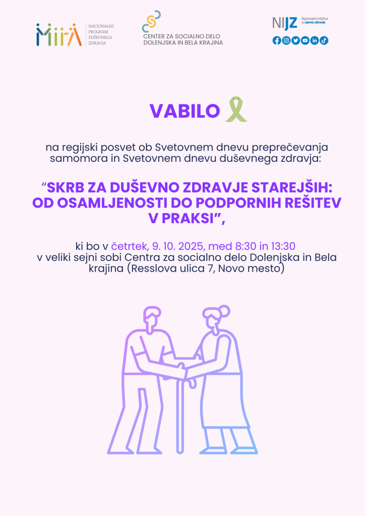 Ob Svetovnem dnevu preprečevanja samomora in Svetovnem dnevu duševnega zdravja vas Nacionalni inštitut za javno zdravje, OE Novo mesto ter Center za socialno delo Dolenjske in Bele krajine vabimo na strokovno srečanje, kjer bomo osvetlili ključne izzive in rešitve za ohranjanje duševnega zdravja starejših. Tema letošnjega dogodka z naslovom “Skrb za duševno zdravje starejših: Od osamljenosti do podpornih rešitev v praksi” bo osredotočena na prepoznavanje težav, ki jih starejši doživljajo, in razvoj praktičnih rešitev za izboljšanje njihovega duševnega počutja.
