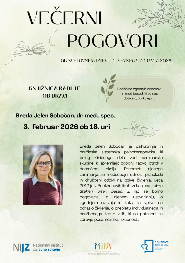 V torek, 3. februarja 2026, ob 18. uri, v knjižnici Radlje ob Dravi, se bomo s psihiatrinjo pogovarjali o njenem ustvarjanju. Izpostavili bomo tudi področje zgodnjega razvoja otroka ter vpliv tega na odraslo življenje. Prav tako bomo naslovili preplet individualnega in družbenega življenja, zanimali pa nas bodo tudi viri, ki so potrebni za zdravje posameznika in skupnosti.