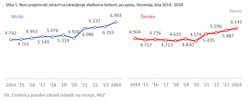 Skupno število oseb, ki prejemajo zdravila za namen zdravljenja sladkorne bolezni v letu 2024 je 130.682, kar je 3.836 več kot leta 2023 in 12.467 več kot leta 2020. Za leto 2024 je ocenjeno število oseb z znano sladkorno boleznijo v Sloveniji 153.700 ob upoštevanju, da se 15% oseb zdravi nefarmakološko. Celokupno število oseb, ki prejemajo zdravila za namen zdravljenja sladkorne bolezni, je v zadnjih desetih letih v porastu (104. 167 v letu 2014 v primerjavi s 130.682 v letu 2024), število tistih oseb med njimi, ki so mlajši od 65 let, pa je praktično stabilno. Ti podatki pokažejo, da je staranje prebivalstva zelo pomemben dejavnik pri povečevanju števila ljudi s sladkorno boleznijo.