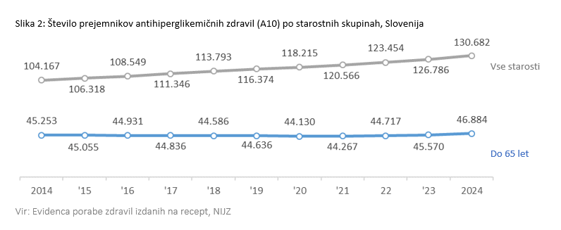 V Sloveniji je bilo v letu 2024 po podatkih NIJZ 130.682 prejemnikov zdravil za zniževanje glukoze z namenom zdravljenja sladkorne bolezni, kar je 3.896 (2,6%) več kot v letu 2023.