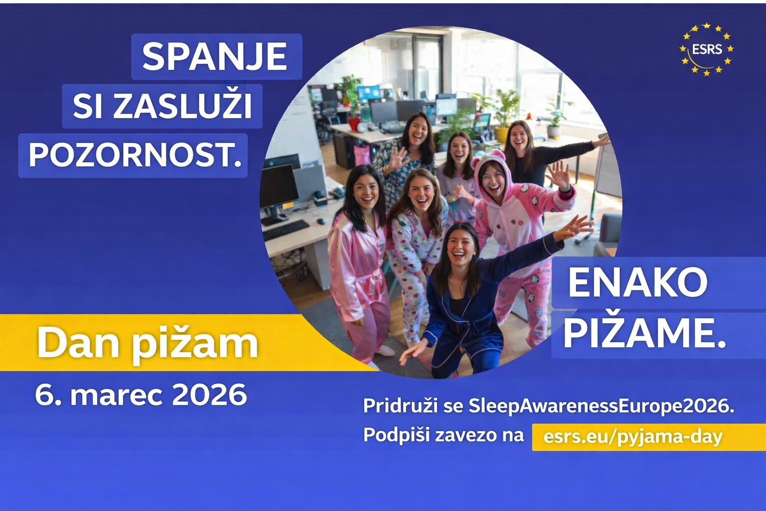 Uporabite ključnik kompanije #PyjamaDayESRS#PyjamaDayERSRS za izmenjavo fotografij in zgodb, ki prikazujejo vašo podporo ozaveščanju o pomenu spanja