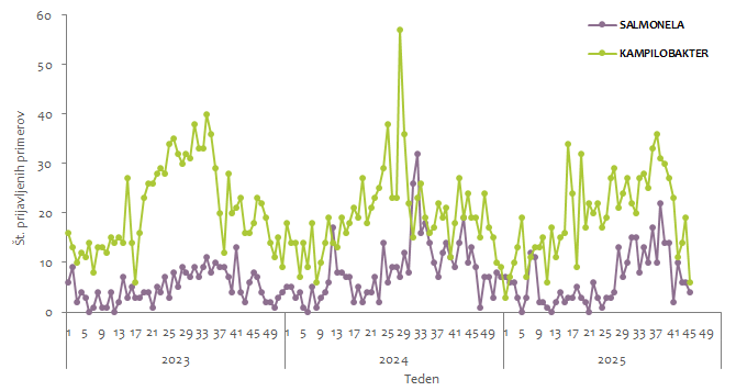 Slika 1: Število prijavljenih primerov okužb s kampilobaktrom in salmonelo po tednih, Slovenija, 1.1.2023–9.11.2025