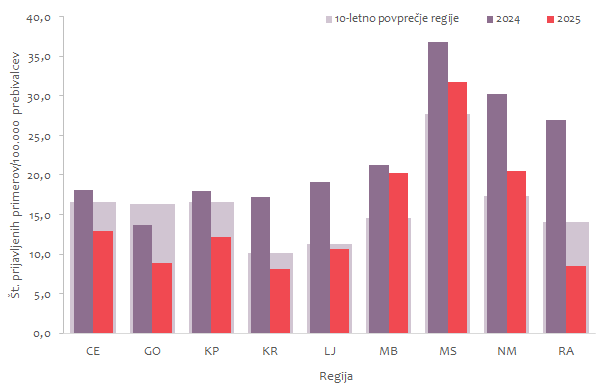Slika 3: Število prijavljenih primerov salmonelnih okužb/100.000 prebivalcev po zdravstvenih regijah, Slovenija, 2024, 2025 ter 10-letno povprečje (2015–2024)